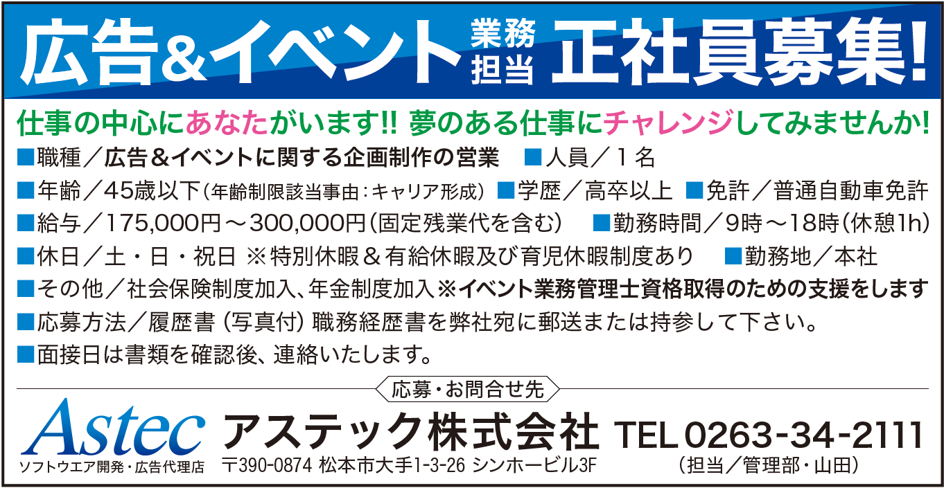 | 問い合わせ先 | ◆採用担当 TEL.0263-34-2111 |